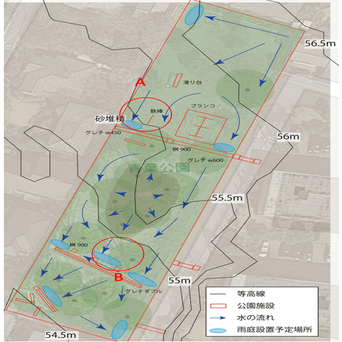 みやび青葉公園園内は北北東から南南西方向にゆるやかに下る微傾斜地であり、降雨時に園内で発生する表流水は、流末に設置された側溝で集水され、下水道に排水される。側溝は中〜大型で一部ダブル側溝が使用され、園内を横断している。園地の地表面は転圧され固められ、極めて浸透しにくい状況となっており、豪雨時には降雨の多くが表流水となり流出することが推測される。側溝の一部には流出による土砂の堆積も見られた。そのため、雨庭の計画・デザイン検討の方針として、側溝の流入直前の表流水流末に雨庭を設置し、表流水を受け止め、浸透貯留による流出抑制を行うこととした。側溝流末端の雨庭設置の候補箇所を下図に青色で表示する。候補箇所の中から、集水のしやすさや動線、タイプの異なる雨庭の設置可能性、ワークショップでの施工性を鑑み、地点A、地点Bの2箇所に設置することとした。