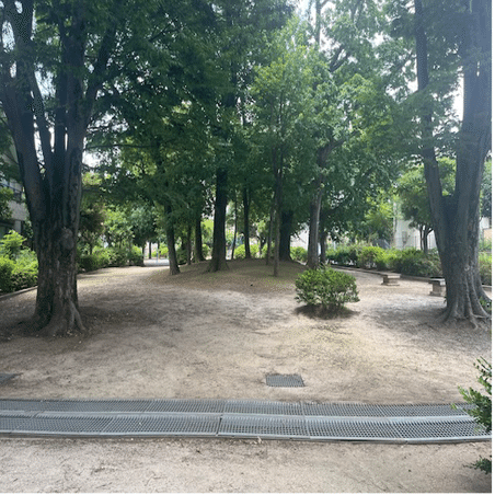 ・地点Aは、園内エッジの植栽地近傍にあり、人の通行は少ない。園内の土砂が流出し、側溝の上に堆積している。また、緑陰により日陰の時間は長い。