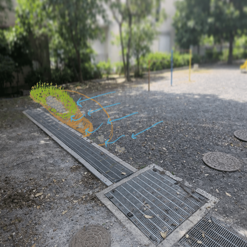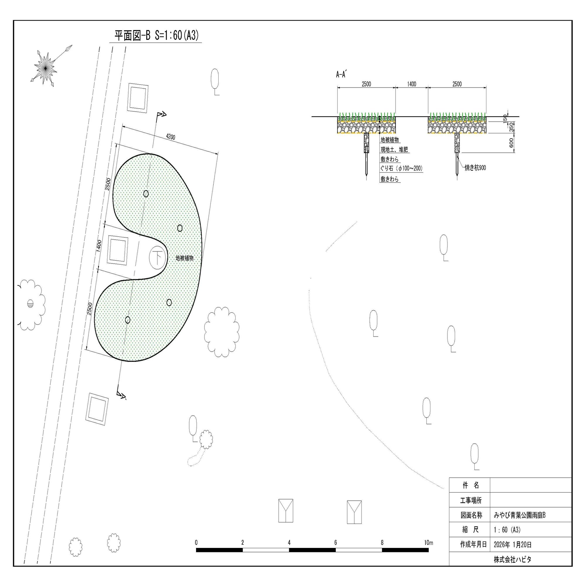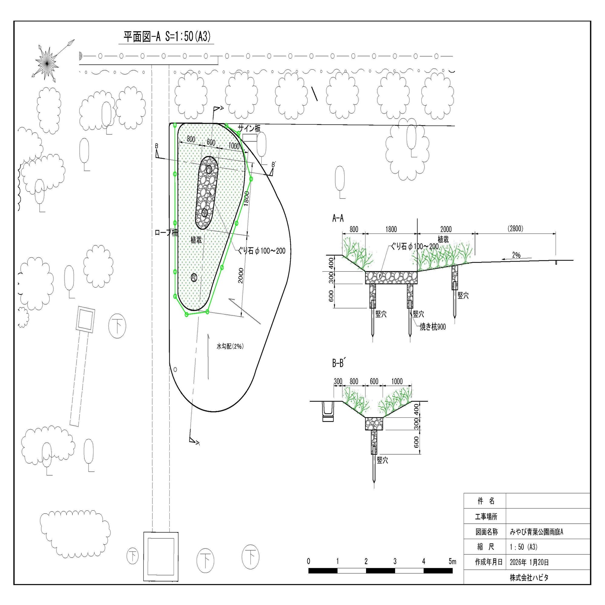 地点Aでは、表流水を側溝の流入直前で受け止め、土砂の流入も抑制することを狙う。また、隣接の民地住宅地とのバッファーゾーンとして、普段は人が入れないが、植栽が生きる場所をつくることは景観的にも生態系としても有用である。武蔵野の在来種を中心としたレインガーデンとし、近隣住民の関心と関与を引き付けるレインガーデンとする。