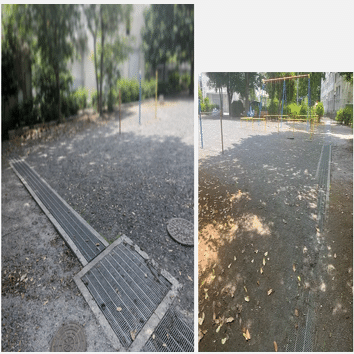 地点Bでは、表流水が側溝に流入する直前でキャッチし貯留しつつ、地表面には人の往来や活動を妨げない、踏圧に強い植栽を植え、通行と植栽地の共存を図る。流下する表流水をキャッチするため微地形に合わせた雨庭形状のデザインがポイントになる。