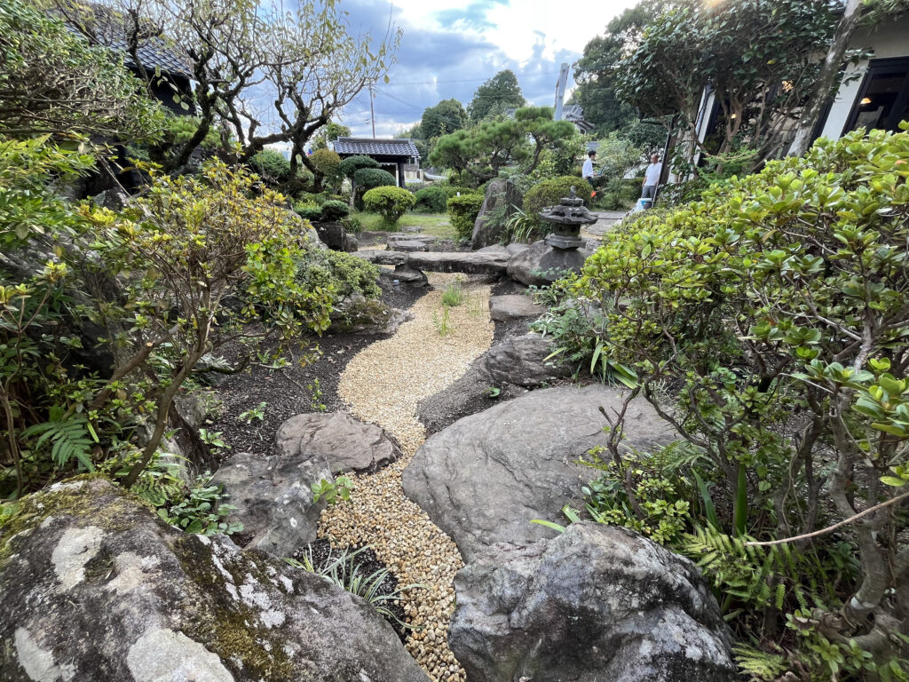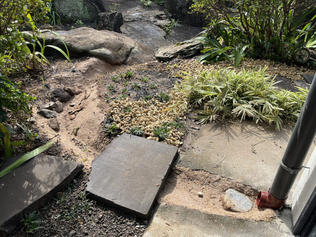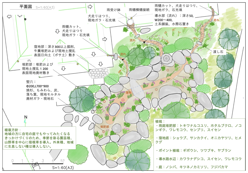 球磨川の流域治水への共創による貢献を目指し、地元の食資源を活かした交流拠点「リュウキンカの郷」にて枯山水庭園を雨庭へ再生しました。枯山水の池底に貼られていたモルタルを撤去し、地元産のコンポスト・牛糞堆肥を加えて植物を活かす土壌と表層に整え、植栽の成長による浸透能向上と石組み景観の鑑賞性向上の両立を狙いました。球磨川の流れを模した石組み枯山水を継承し、建築雨樋からの雨水を、球磨川の「支流」に見立てた「遣水」で庭を巡らせゆっくりと「本流」としての雨庭窪地へ導水。窪地での貯留と、雨庭底面からの浸透に加え、竪穴による鉛直方向への浸透を促進しています。雨庭と周辺には四季を彩る自然風の植栽を導入しました。熊本県造園建設業協会の協力のもと、市民・事業者との協働で施工を行い、地元小学校の環境教育素材や地元農家民泊への普及等への動きが広がっています。