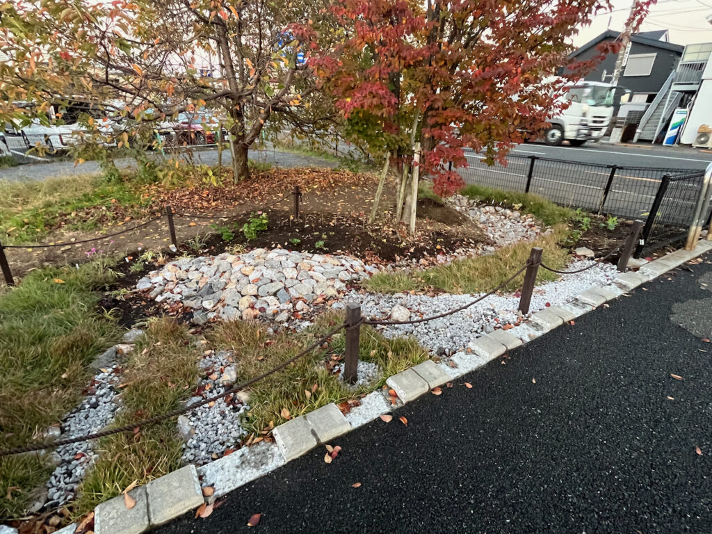 花の木公園では、表土が踏み固められ、雨水浸透機能の低下の結果、大雨の度に敷地外の道路へ泥水