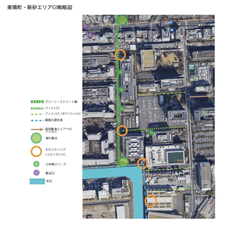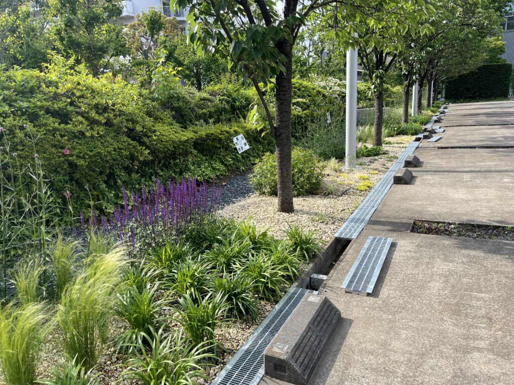●東陽町グリーンストリート地域実装 民地・公園・水辺・街路が連携したGIビジョンから企業駐車場のレインガーデン実装まで、エリアのGI実装を民間主導で推進 (2023〜継続中)竹中工務店、水辺総研