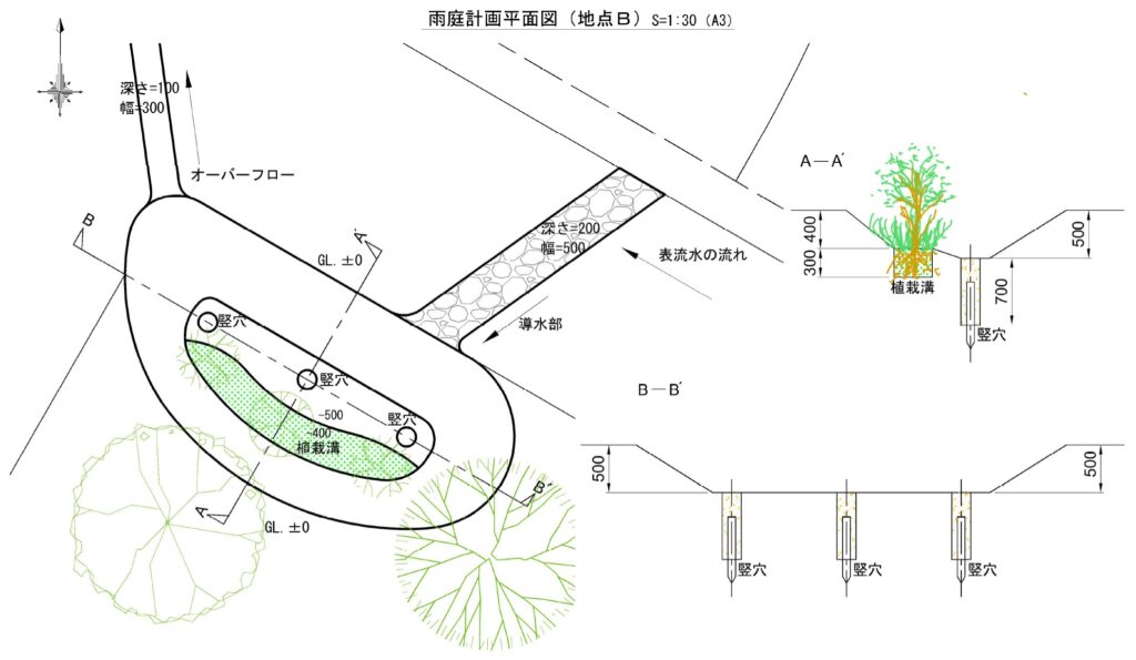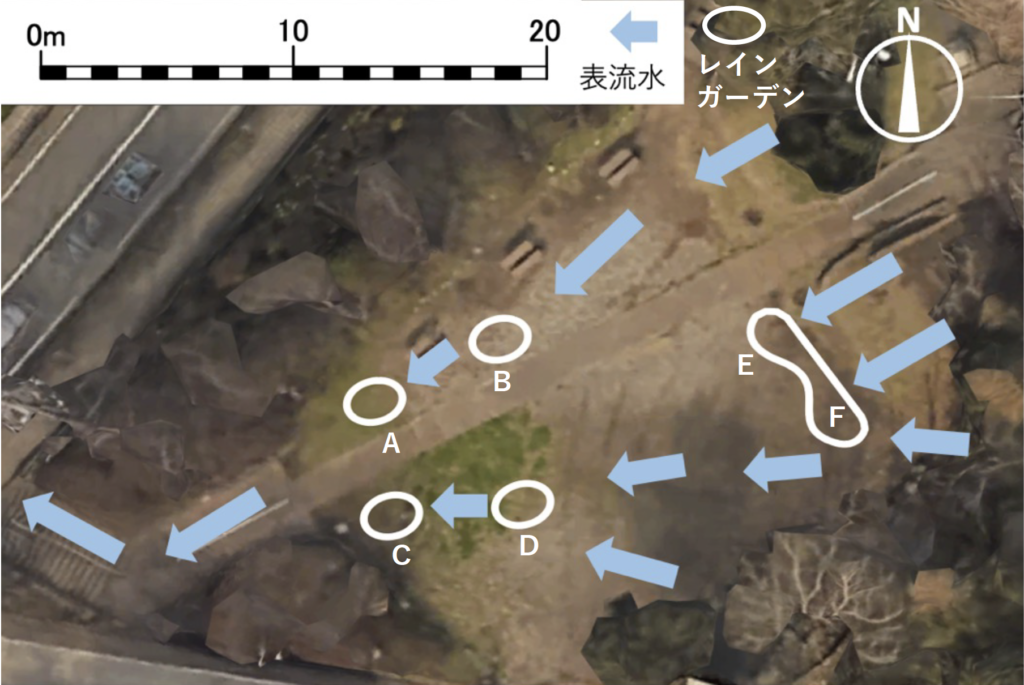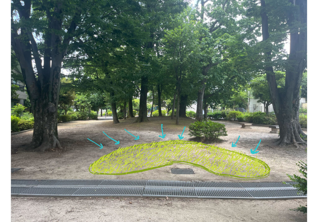流出を繰り返し、通勤・通学の妨げとなっていました。まちなかを歩き雨水による被害を把握す「みずみちウォーキング」や、民地でのモデルレインガーデン設置などを行い、共鳴する市民を増やし、公園にてレインガーデンの市民施工ワークショップを実施しました。計画では、浸透能、流出量測定を行った上で流出抑制計画量(60mm/hr の30% 抑制)を設定し、公園全体をひとつの小流域として捉え、雨水の流れに分散的にレインガーデンを配置しました。施工後には、泥水流出の頻度や量が減ったとの報告が住民からありました。設置後のレインガーデンでは、流出量の効果測定を行うとともに市民が定期的な草刈りを行い、子どもが生き物と遊べる適度な高茎草地環境の維持・保全を行い、公園の価値向上に貢献しています。
