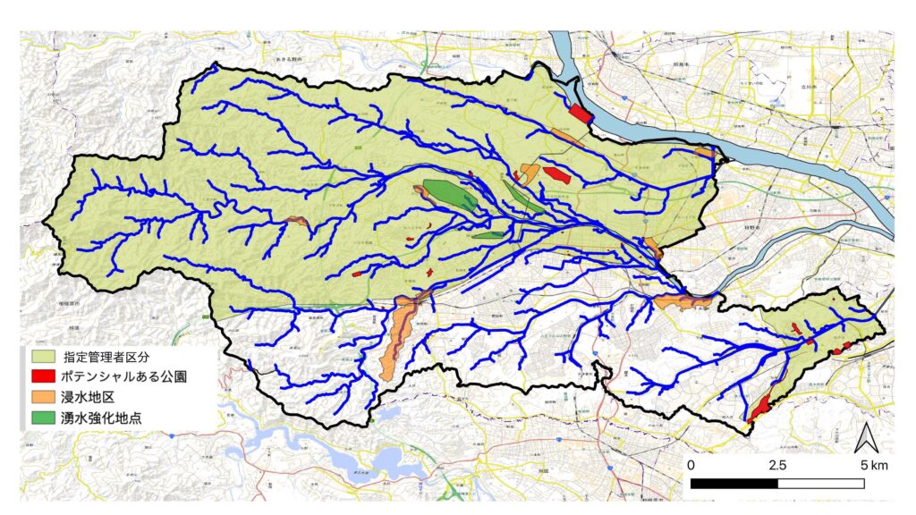 さらに、市全域の公共空間(公園、道路、公共建築等)における流出抑制型GI ポテンシャルを抽出・