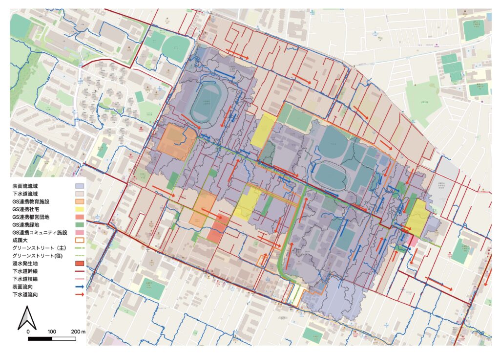 さらに、市全域の公共空間(公園、道路、公共建築等)における流出抑制型GI ポテンシャルを抽出・整理し、次年度以降の市域におけるGI 展開を検討しました。